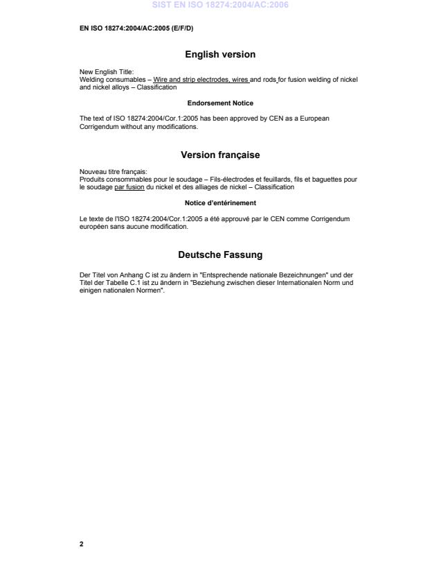 (Corrigendum)Welding consumables - Wire and strips electrodes, wires and rods for fusion welding of nickel and nickel alloys - Classification (ISO 18274:2004)