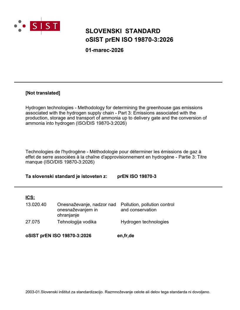 prEN ISO 19870-3 is a draft published by the European Committee for Standardization (CEN). Its full title is "Hydrogen technologies - Methodology for determining the greenhouse gas emissions associated with the hydrogen supply chain - Part 3: Emissions associated with the production, storage and transport of ammonia up to delivery gate and the conversion of ammonia into hydrogen (ISO/DIS 19870-3:2026)". This standard covers: The scope of this proposal is to establish a methodology and analytical framework to determine the GHG emissions related to the production and transport of Ammonia up to the consumption gate and related to the conversion of Ammonia into hydrogen and its transport to consumption gate.