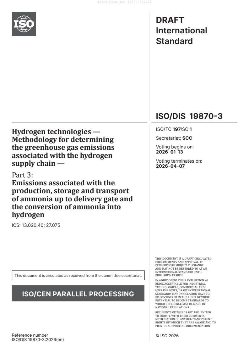 Hydrogen technologies - Methodology for determining the greenhouse gas emissions associated with the hydrogen supply chain - Part 3: Emissions associated with the production, storage and transport of ammonia up to delivery gate and the conversion of ammonia into hydrogen (ISO/DIS 19870-3:2026)