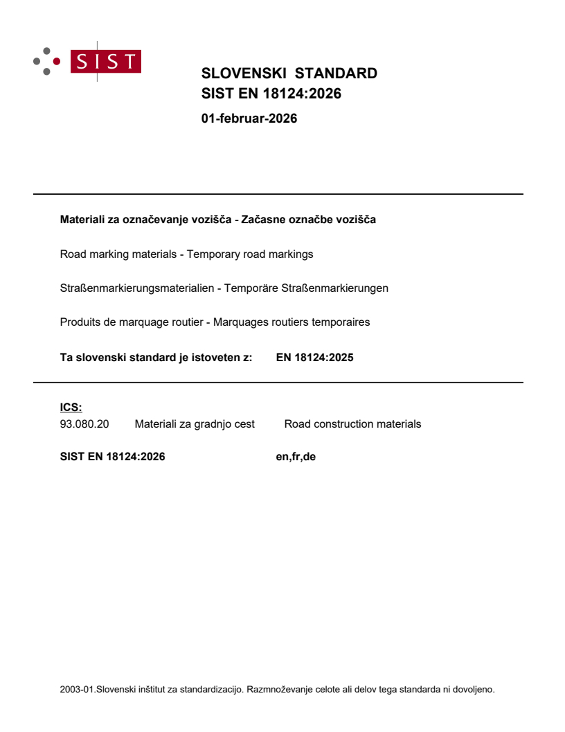 EN 18124:2025 - Road marking materials - Temporary road markings (CEN) defines requirements for white, yellow and orange temporary road markings used in circulation areas. The standard covers both preformed products (tape, preformed cold or thermoplastic) and assemblies (paint/thermoplastic/cold plastic with drop-on materials). It also sets out procedures for evaluation of conformity, including type testing and factory production control (FPC), and provides guidance on removability.