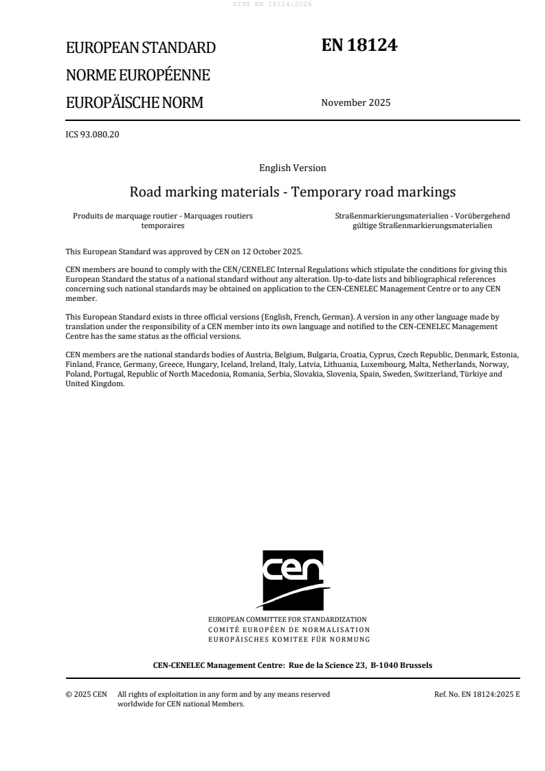 EN 18124:2025 is a standard published by the European Committee for Standardization (CEN). Its full title is "Road marking materials - Temporary road markings". This standard covers: This document specifies white, yellow and orange road markings, removable or non-removable, under the form of road marking assemblies or preformed road markings, to be used for temporary road markings in circulation areas. Other road marking products and colours intended for temporary road markings are not covered in this document. This document also gives specifications for the evaluation of conformity of temporary road markings in circulation areas including type testing and factory production control.