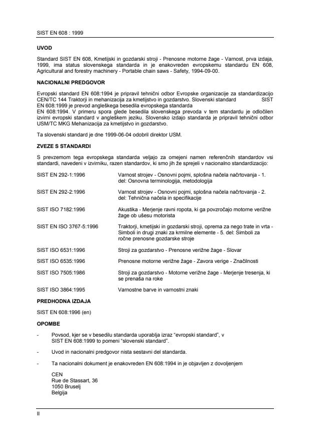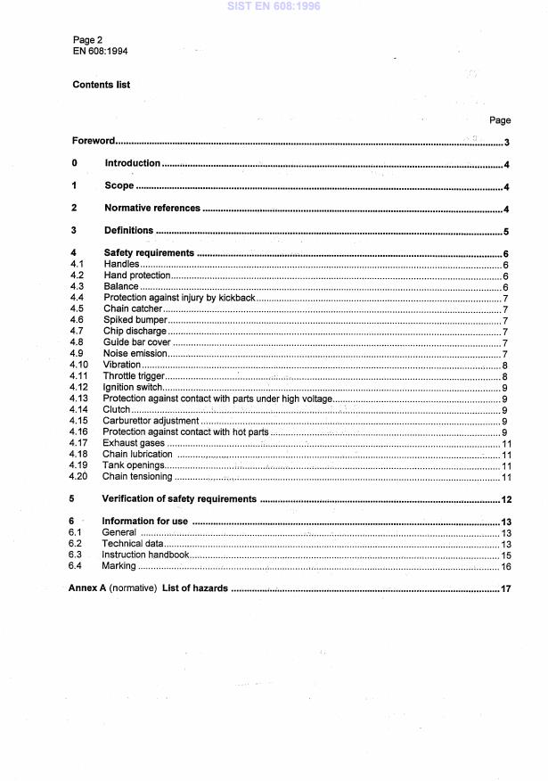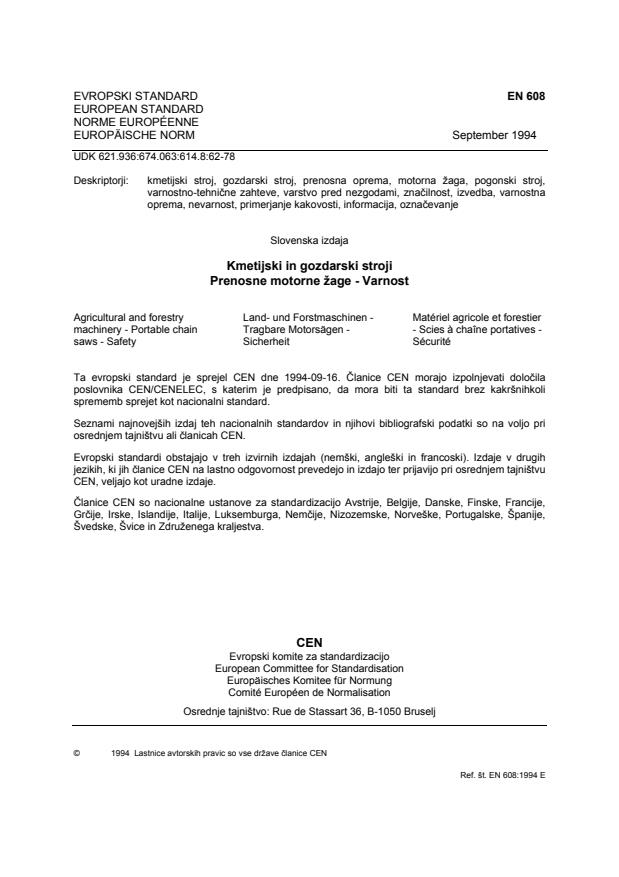 Standard SIST EN 608, Kmetijski in gozdarski stroji - Prenosne motorne žage - Varnost, prva izdaja,