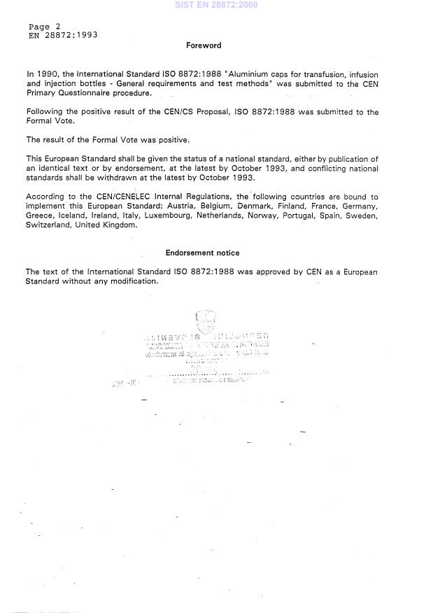 EN 28872:1993 is a standard published by the European Committee for Standardization (CEN). Its full title is "Aluminium caps for transfusion, infusion and injection bottles - General requirements and test methods (ISO 8872:1988)". This standard covers: Aluminium caps for transfusion, infusion and injection bottles - General requirements and test methods (ISO 8872:1988)