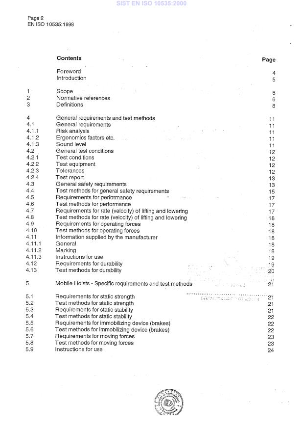 EN ISO 10535:1998 is a standard published by the European Committee for Standardization (CEN). Its full title is "Hoists for the transfer of disabled persons - Requirements and test methods (ISO 10535:1998)". This standard covers: This European standard specifies requirements and test methods only for hoists and body support units intended for the transfer of disabled persons as classified in EN ISO 9999:1998 : 12 36 03 Wheeled hoists with sling seats 12 36 06 Wheeled hoists with solid seats 12 36 09 Hoist trolleys 12 36 12 Stationary hoists fixed to the wall/walls, floor and/or ceiling 12 36 15 Stationary hoists fixed to, mounted in or on another product 12 36 18 Stationary free standing hoists 12 36 21 Body-support units for hoists This standard does not apply to devices that transport persons between two levels (floors) of a building. This standard does not include methods for determination of ageing or corrosion of such hoists units. The requirements of this standard are formulated with regard to the needs of both the disabled persons being hoisted and the attendant using the hoist.