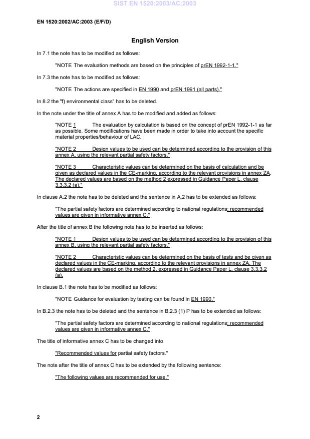 Characteristic values can be determined on the basis of tests and be given asdeclared values in the CE-marking, according to the relevant provisions in annex ZA. Thedeclared values are based on the method 2, expressed in Guidance Paper L, clause 3.3.3.2(a).In clause B.1 the note has to be modified as follows:"NOTEGuidance for evaluation by testing can be found in EN 1990."In B.2.3 the note has to be deleted and the sentence in B.2.3 (1) P has to be extended as follows:"The partial safety factors are determined according to national regulations; recommendedvalues are given in informative annex C."The title of informative annex C has to be changed into"Recommended values for partial safety factors."The note after the title of annex C has to be extended by the following sentence:"The following values are recommended for use."SIST EN 1520:2003/AC:2003