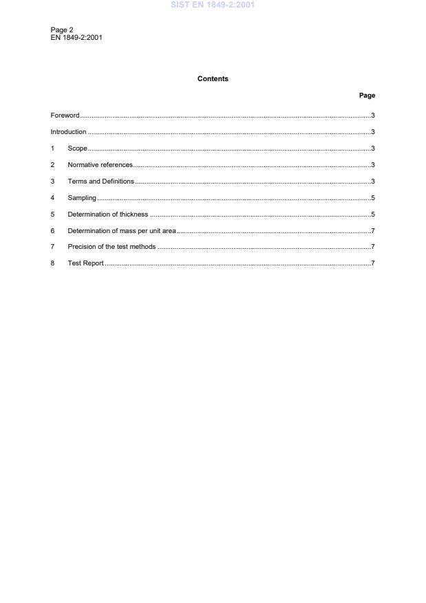 Page 2EN 1849-2:2001ContentsPageForeword.3Introduction.31Scope.32Normative references.33Terms and Definitions.34Sampling.55Determination of thickness.56Determination of mass per unit area.77Precision of the test methods.78Test Report.7SIST EN 1849-2:2001