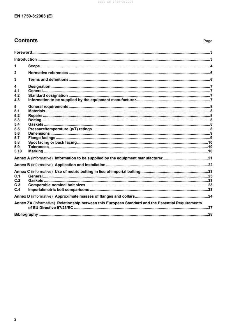 - Informative annexes: Annex A (manufacturer information), B (application/installation), C (metric vs imperial bolting), D (approximate masses), ZA (relation to PED).