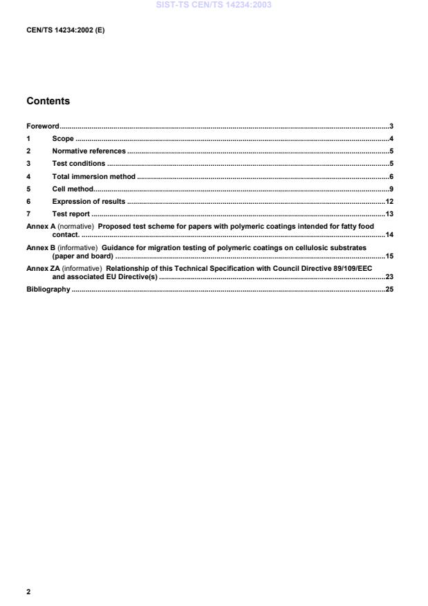 CEN/TS 14234:2002 is a technical specification published by the European Committee for Standardization (CEN). Its full title is "Materials and articles in contact with foodstuffs - Polymeric coatings on paper and board- Guide to the selection of conditions and test methods for overall migration". This standard covers: This Technical Specification specifies test methods for 'alternative tests' and 'substitute tests' performed with volatile test media, iso-octane and a volume fraction of 95 % aqueous ethanol, for the determination of overall migration from polymeric coatings on paper and board intended to come into contact with fatty foodstuffs. NOTE 1 It also includes guidance for the application of Council Directive 82/711/EEC [1], as last amended by Commission Directives 93/8/EC and 97/48/EC [2] [3] as regards the determination of the specific and overall migration into fatty food simulants (fat test) and includes a glossary to clarify the terminology used, see annex B. NOTE 2 The iso-octane and a volume fraction of 95 % aqueous ethanol volatile test media used in these test methods are those specified for 'substitute tests' in Council Directive 82/711/EEC and its subsequent amendments. In addition to the use of iso-octane and 95 % v/v aqueous ethanol as test media for 'substitute tests', Council Directive 82/711/EEC and its subsequent amendments specifies the use of modified polyphenylene oxide as a test medium for use at temperatures of 100 °C and above. A test method for overall migration from polymeric coatings intended to come into contact with fatty foodstuffs using modified polyphenylene oxide (MPPO) is in preparation.