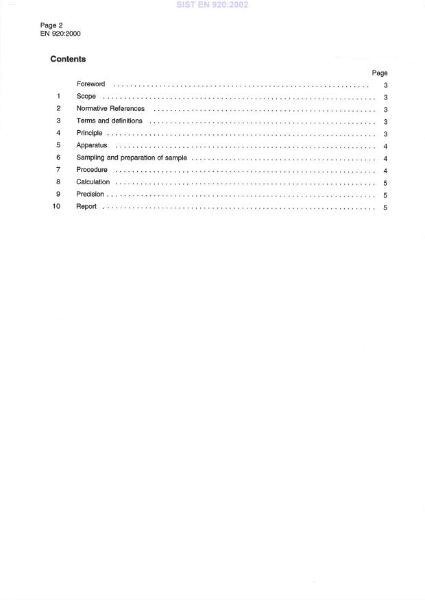 EN 920:2000 is a standard published by the European Committee for Standardization (CEN). Its full title is "Paper and board intended to come into contact with foodstuffs - Determination of dry matter content in an aqueous extract". This standard covers: This European Standard specifies a test method for the determination of the dry matter content of a hot- or cold-water extract from paper or board. It is applicable to paper and board intended for boiling or filtering of foodstuffs. The lower limit of determination of the method is about 1000 mg/kg of paper. This corresponds to 1 mg/dm2 of a paper with a grammage of 100 g/m2 or 2 mg/dm2 for a board with a grammage of 200 g/m2.