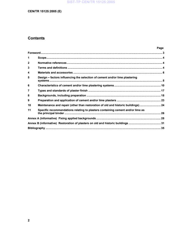 CEN/TR 15125:2005 is a technical report published by the European Committee for Standardization (CEN). Its full title is "Design, preparation and application of internal cement and/or lime plastering systems". This standard covers: This document concerns the design, preparation and application of internal plaster and plastering systems based on cement and/or lime for internal plastering on all types of background used under normal conditions. It includes plastering onto both new and old backgrounds and the maintenance and repair of existing work. It concerns materials, backgrounds, preparation of the surface to be plastered, choice of suitable cement and/or lime plastering system, methods of application and inspection and testing of plastering. Cement and/or lime plastering mixes with special properties intended to enhance thermal insulation, fire resistance, acoustic insulation and to increase radiation absorption are also covered. Because of the many and varied materials and practices in Europe it is not possible for certain aspects of the standard to enter into sufficient detail to be fully usable to practitioners in each country.