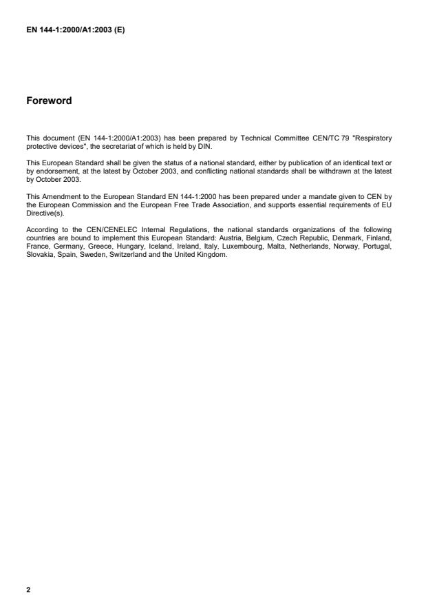 This amendment A1 modifies the European Standard EN 144-1:2000; it was approved by CEN on 28 February 2003.