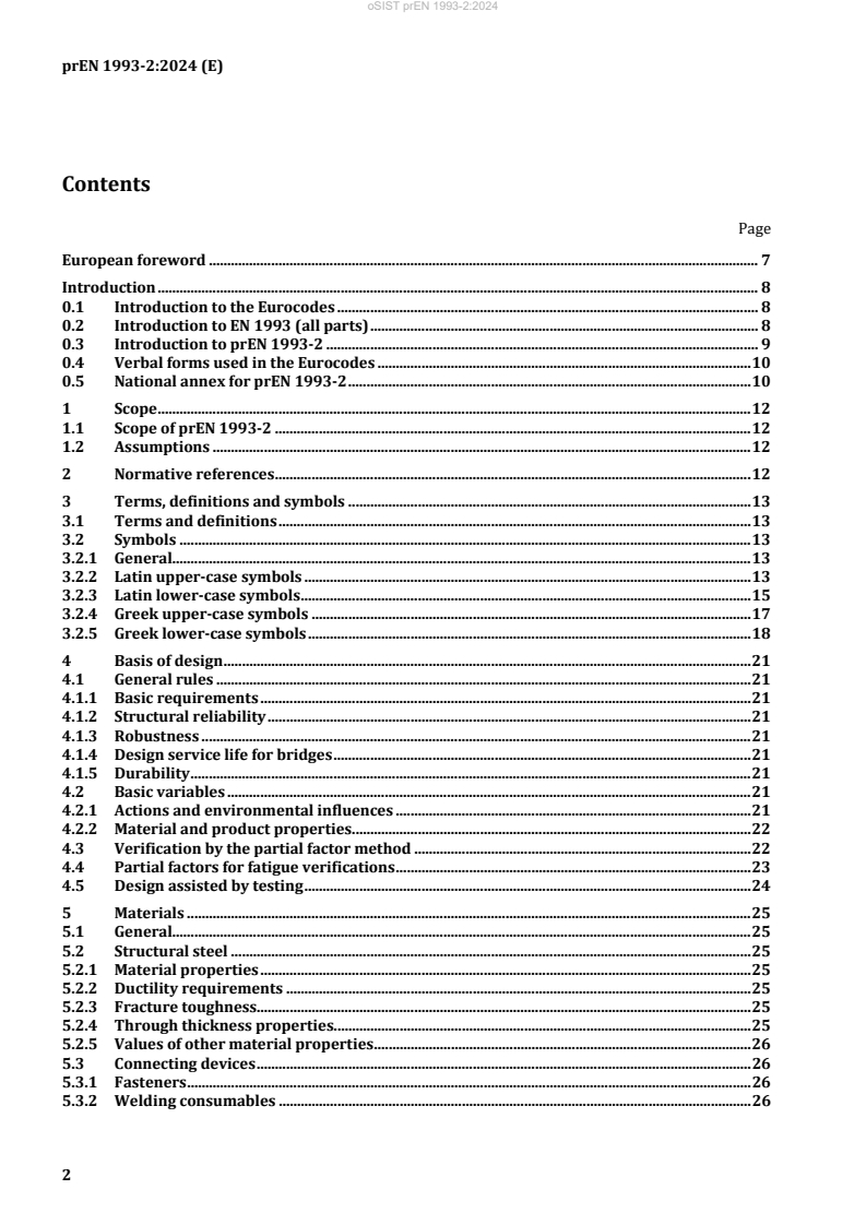 EN 1993-2:2026 is a draft published by the European Committee for Standardization (CEN). Its full title is "Eurocode 3 - Design of steel structures - Part 2: Bridges". This standard covers: 1.1 Scope of FprEN 1993 2 (1) This document provides rules for the structural design of steel bridges and steel parts of steel-concrete composite bridges. (2) This document is applicable to the resistance, serviceability and durability of steel bridge structures. (3) The design of tension components and related parts is covered by EN 1993 1 11. NOTE For the design of hangers for tied-arch bridges, additional provisions are given in Annex A. (4) Supplementary requirements for seismic design are given in EN 1998 2. 1.2 Assumptions (1) Unless specifically stated, EN 1990, EN 1991 (all parts), EN 1998 (all parts) and EN 1993 1 (all parts) apply. (2) The design methods given in FprEN 1993 2 are applicable if: - the execution quality is as specified in EN 1090 2 and EN 1090 4, and - the construction materials and products used are as specified in the relevant parts of EN 1993, or in the relevant material and product specifications.