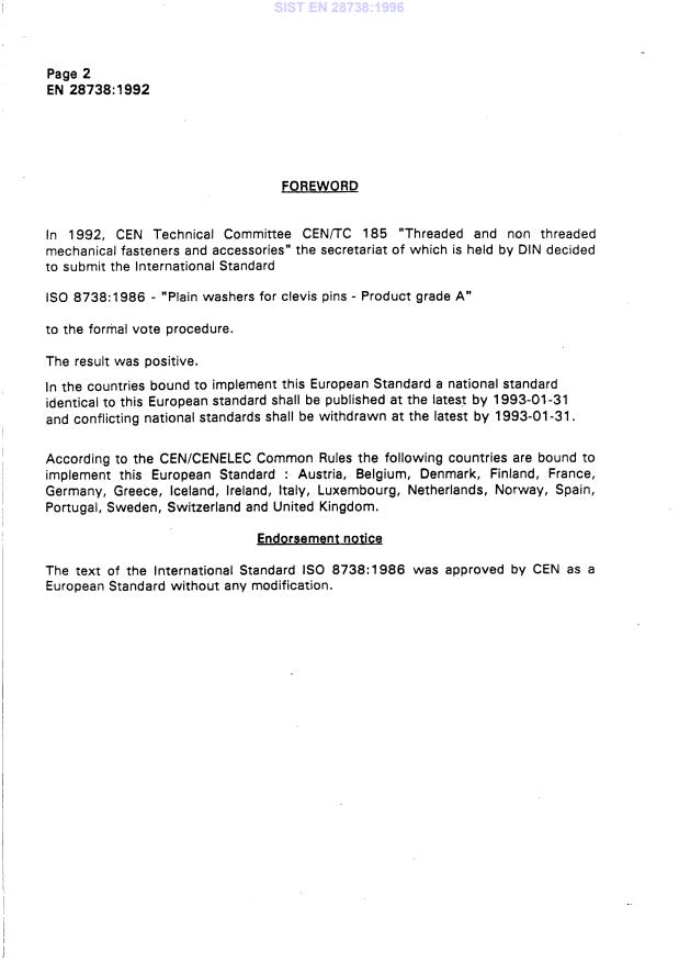 2003-01.Slovenski inštitut za standardizacijo. Razmnoževanje celote ali delov tega standarda ni dovoljeno.Podložke za sornike - Razred izdelave AScheiben für Bolzen - Produktklasse A (ISO 8738:1986)Rondelles plates pour axes d'articulation - Grade A (ISO 8738:1986)Plain washers for clevis pins - Product grade A (ISO 8738:1986)21.0