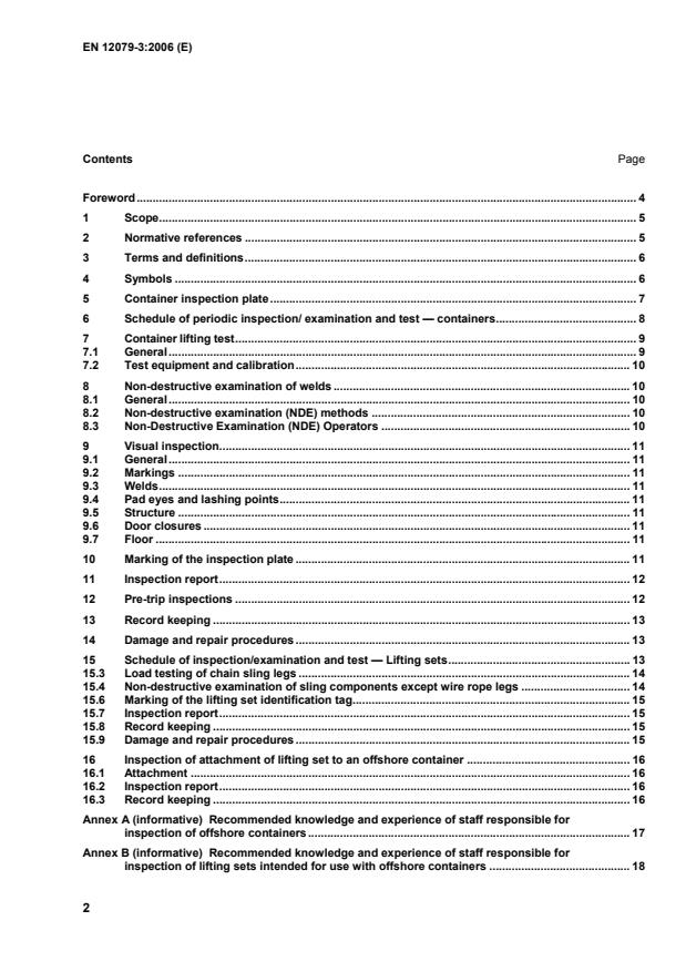 2 Normative references The following referenced documents are indispensable for the application of this European Standard. For dated references, only the edition cited applies. For undated references, the latest edition of the referenced document (including any amendments) applies. EN 12079-1:2006, Offshore containers and associated lifting sets — Part 1: Offshore containers — Design, manufacture and marking EN 12079-2:2006, Offshore containers and associated lifting sets — Part 2: Lifting sets — Design, manufacture and marking EN 473, Non-destructive testing - Qualification and certification of NDT personnel - General principles EN 571-1, Non-destructive testing - Penetrant testing - General principles EN 818-4:1996, Short link chain for lifting purposes - Safety - Part 4:Chain slings - Grade 8 EN 818-6, Short link chain for lifting purposes - Safety - Part 6:Chain slings - Specification for information for use and maintenance to be provided by the manufacturer EN 970, Non-destructive examination of fusion welds - Visual examination EN 1289, Non-destructive examination of welds - Penetrant testing of welds - Acceptance levels EN 1290, Non-destructive examination of welds - Magnetic particle examination of welds EN 1291, Non-destructive testing of welds - Magnetic particle testing of welds - Acceptance levels EN 1435, Non-destructive examination of welds - Radiographic examination of welded joints