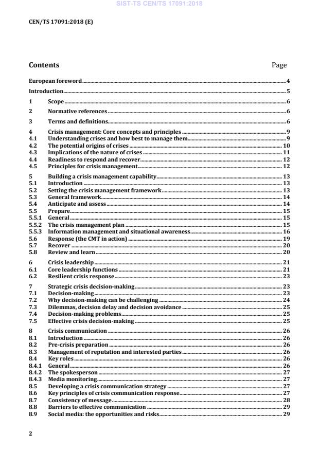 CEN/TS 17091:2018 is a technical specification published by the European Committee for Standardization (CEN). Its full title is "Crisis management - Guidance for developing a strategic capability". This standard covers: This document provides guidance on good practice for crisis management to help the strategic decision makers of an organization to plan, implement, establish, operate, monitor, review, maintain and continually improve a crisis management capability. It is intended for any organization regardless of location, size, type, industry, structure, or sector. While it is important to be aware of human and cultural factors as they can cause stress when working as individuals and as part of groups, it is not the purpose of this document to examine aspects of these areas in detail. This document provides guidance for: - understanding the context and challenges of crisis management; - developing an organization’s crisis management capability through preparedness (see 5.5); - recognizing the complexities facing a crisis team in action; - communicating successfully during a crisis; and - reviewing and learning. NOTE 1 For further information on organizational resilience, see ISO 22316. This technical specification is intended for management with strategic responsibilities for the delivery of a crisis management capability. It is for those who operate under the direction and within policy of top management in: - implementing the crisis plans and structures; and - maintaining and assuring the procedures associated with the capability. It is not intended for emergency and incident response - these require the application of operational procedures whereas crisis management relies on an adaptive, agile, and flexible strategic response (see 4.3). It does not cover interoperability or command and control or business continuity management systems. NOTE 2 For more information on interoperability and command and control, see ISO 22320. For more information on business continuity management systems, please see EN ISO 22301.