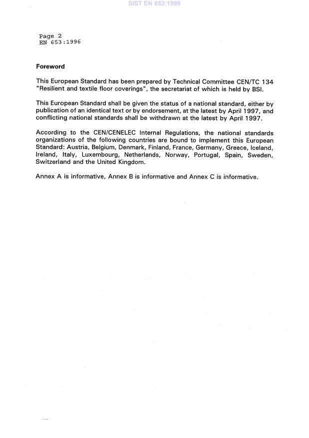 EN 653:1996 is a standard published by the European Committee for Standardization (CEN). Its full title is "Resilient floor coverings - Expanded (cushioned) polyvinyl chloride floor coverings - Specification". This standard covers: This European Standard specifies the characteristics of floor coverings based on expanded (cushioned) polyvinyl chloride and modifications thereof supplied in either tile or roll form. To encourage the consumer to make an informed choice, the standard includes a classification system (see EN 685) based on intensity of use, which shows where these floor coverings should give satisfactory service. It also specifies requirements for marking.
