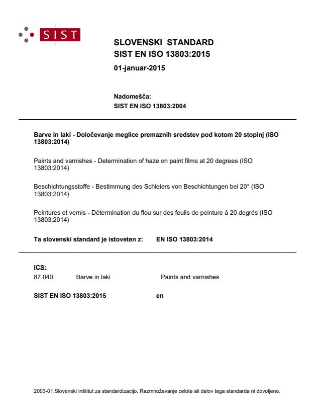 EN ISO 13803:2014 is a standard published by the European Committee for Standardization (CEN). Its full title is "Paints and varnishes - Determination of haze on paint films at 20° (ISO 13803:2014)". This standard covers: ISO 13803:2014 specifies a test method for determining the haze of coatings. The method is suitable for the haze measurement of non-textures coatings on plane, opaque substrates. The use of the 20° geometry means that the method is closely related to the measurement of gloss at 20° in ISO 2813. The application of this method is intended to give improved differentiation between high-gloss surfaces, for example in the field of assessment of dispersion characteristics.