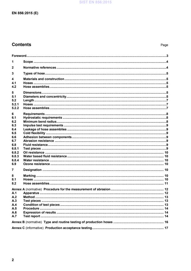 EN 856:2015 is a standard published by the European Committee for Standardization (CEN). Its full title is "Rubber hoses and hose assemblies - Rubber-covered spiral wire reinforced hydraulic type - Specification". This standard covers: This European Standard specifies requirements for four types of rubber-covered spiral wire reinforced hydraulic hoses and hose assemblies of nominal bore from 6 to 51: Types 4SP, 4SH, R12 and R13. They are all suitable for use with: - hydraulic fluids in accordance with ISO 6743 4 with the exception of HFD R, HFD S and HFD T at temperatures ranging from −40 °C to +100 °C for types 4SP and 4SH and −40 °C to +120 °C for types R12 and R13; - water based fluids at temperatures ranging from −40 °C to 70 °C; - water fluids at temperatures ranging from 0 °C to 70 °C. This European Standard does not include requirements for end fittings. It is limited to the performance of hoses and hose assemblies. NOTE 1 The hoses are not suitable for use with castor oil based nor ester based fluids. NOTE 2 Hoses and hose assemblies are not be operated outside the limits of this standard. NOTE 3 Requirements for hydraulic hoses for underground mining are standardised in a separate standard.