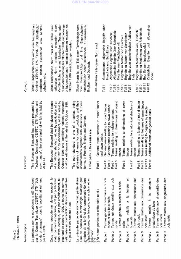 EN 844-10:1998 is a standard published by the European Committee for Standardization (CEN). Its full title is "Round and sawn timber - Terminology - Part 10: Terms relating to stain and fungal attack". This standard covers: This part of this standard defines terms relating to stain and fungal attack used in European Standards. The definitions in this part standard are intended for general commercial use. NOTE: In case of dispute, attention is drawn to the definitions given in standards prepared by CEN/TC 38 "Durability of wood and derived materials".