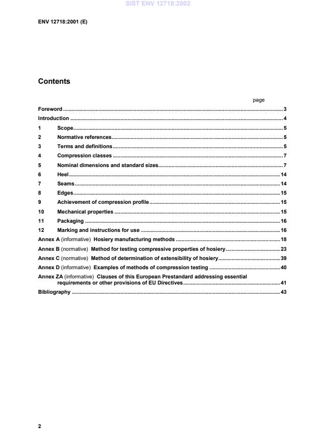 ENV 12718:2001 is a standardization document published by the European Committee for Standardization (CEN). Its full title is "Medical compression hosiery". This standard covers: This European Prestandard specifies requirements and gives test methods for medical compression hosiery, including custom-made hosiery (class 030606, EN 29999), knitted from threads made of natural fibres or synthetic fibres and elastic threads. It is applicable to medical compression hosiery which is used as a medical device for the treatment of venous and/or lymphatic diseases of the leg. This European Prestandard does not give requirements connected with the manufacture of hosiery. NOTE Manufacturing methods that have been shown by experience to be satisfactory are given for information in annex A.