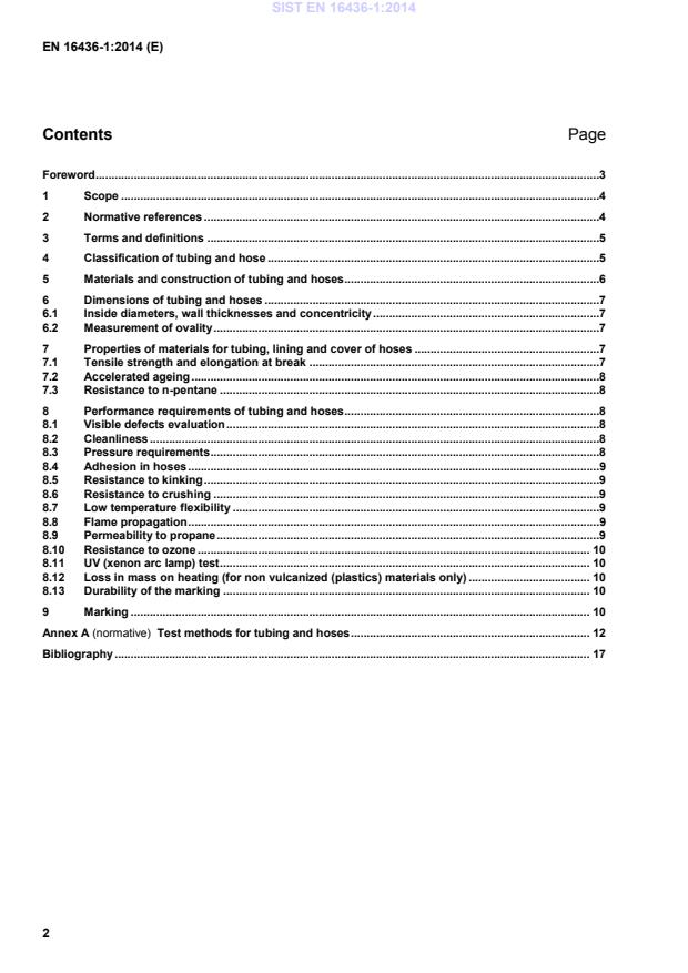 in environments of a temperature range from –30 °C to +70 °C. Working pressures are from 0 bar to 30 bar. Three classes are defined in Table 1 according to the maximum working pressures and minimum ambient temperatures. This European Standard only covers the tubing or hose part of assemblies. The assemblies themselves will be covered by EN 16436-2. This European Standard does not apply to hoses for: welding purposes (see EN ISO 3821, EN 1327); propulsion purposes; LPG transfer purposes (see EN 1762). 2 Normative references The following documents, in whole or in part, are normatively referenced in this document and are indispensable for its application. For dated references, only the edition cited applies. For undated references, the latest edition of the referenced document (including any amendments) applies. EN ISO 176, Plastics - Determination of loss of plasticizers - Activated carbon method (ISO 176) EN ISO 1402, Rubber and plastics hoses and hose assemblies - Hydrostatic testing (ISO 1402) EN ISO 4080, Rubber and plastics hoses and hose assemblies - Determination of permeability to gas (ISO 4080) EN ISO 4671, Rubber and plastics hoses and hose assemblies - Methods of measurement of the dimensions of hoses and the lengths of hose assemblies (ISO 4671) EN ISO 7326, Rubber and plastics hoses - Assessment of ozone resistance under static conditions (ISO 7326) EN ISO 8033, Rubber and plastics hoses - Determination of adhesion between components (ISO 8033) EN ISO 8330:2008, Rubber and plastics hoses and hose assemblies - Vocabulary (ISO 8330:2007) EN ISO 10619-2, Rubber and plastics hoses and tubing - Measurement of flexibility and stiffness - Part 2: Bending tests at sub-ambient temperatures (ISO 10619-2) SIST EN 16436-1:2014