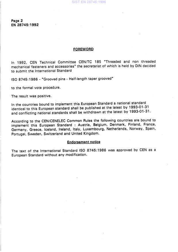 EN 28745:1992 is a standard published by the European Committee for Standardization (CEN). Its full title is "Grooved pins - Half-length taper grooved (ISO 8745:1986)". This standard covers: Grooved pins - Half-length taper grooved (ISO 8745:1986)