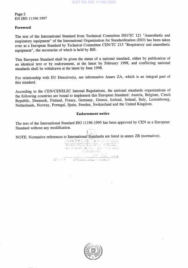 EN ISO 11196:1997 is a standard published by the European Committee for Standardization (CEN). Its full title is "Anaesthetic gas monitors (ISO 11196:1995 including Technical Corrigendum 1:1997)". This standard covers: NOTE1: See the rationale in annex N. ISO 11196 is one of a series of International Standards based on IEC 601-1; in IEC 601-1 (the "General Standard"), this type of International Standard is referred to as a "Particular Standard". As stated in 1.3 of IEC 601-1:1988, the requirements of this International Standard take precedence over those of IEC 601-1. The scope and object given in clause 1 of IEC 601-1:1998 apply except that 1.1 shall be replaced by the following: This International Standard specifies requirements for anaesthetic gas monitors intended for use in determining the anaesthetic vapour and/or gas level(s) in breathing gas mixtures and/or fresh gas mixtures. Both diverting and non-diverting anaesthetic gas monitors are covered, irrespective of the measuring technology used. Also included are anaesthetic gas identifying monitors. The field of application includes monitoring patient breathing mixtures, the output of anaesthesia workstations, and the output of vaporizers as well as anaesthesia ventilators and breathing systems. Anaesthetic gas monitors intended for use in laboratory research, non-human applications or for calibration of anaesthetic agent vaporizers are outside the scope of this International Standard. Anaesthetic gases addressed in this International Standard include, but are not limited to, halothane, enflurane, isoflurane, sevoflurane, desflurane and nitrous oxide.