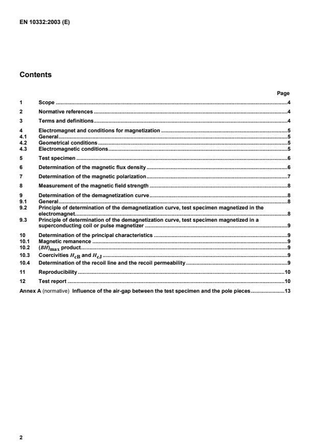 EN 10332:2003 is a standard published by the European Committee for Standardization (CEN). Its full title is "Magnetic materials - Permanent magnet (magnetically hard) materials - Methods of measurement of magnetic properties". This standard covers: This European standard specifies the method of measurement of the magnetic flux density, magnetic polarization and the magnetic field strength and also the determination of the demagnetization curve and recoil line of permanent magnet materials, such as those specified in IEC 404-8-1, the properties of which are presumed homogeneous throughout their volume. The performance of a magnetic system is not only dependent on the properties of the permanent magnet material but also on the dimensions of the system, the air-gap and other elements of the magnetic circuit. The methods described in this standard refer to the measurement on the magnetic properties in a closed magnetic circuit simulating a ring.
