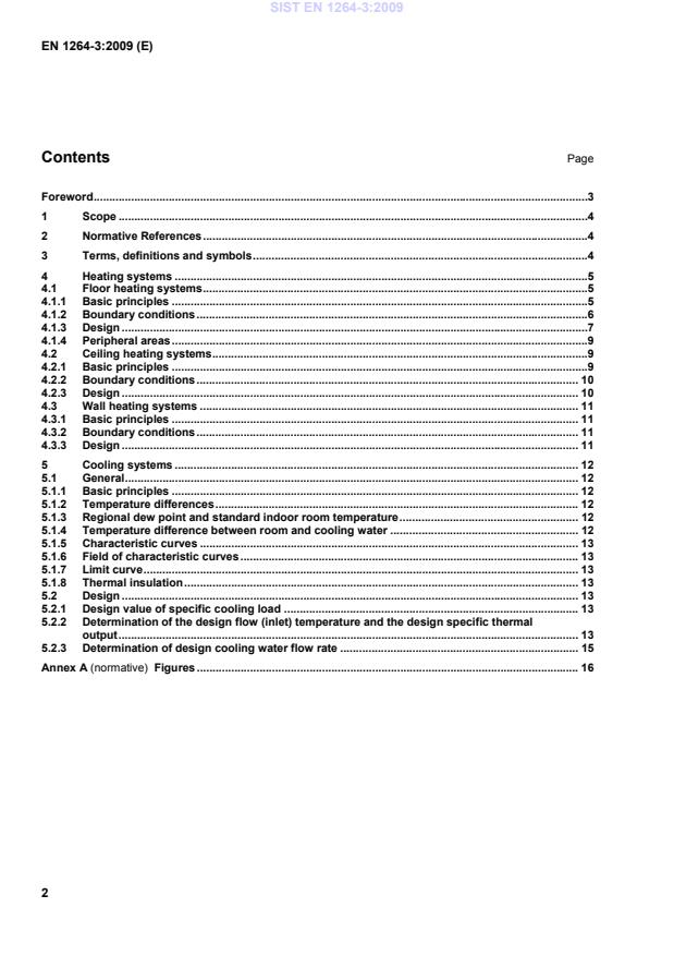 1 Scope This European Standard applies to heating and cooling systems embedded into the enclosure surfaces of the room to be heated or to be cooled. This document deals with the use in practical engineering of the results coming from part 2 and 5 and is applicable to floor-, ceiling- and wall heating systems, as well floor-, ceiling- and wall cooling systems. For heating systems, physiological limitations are taken into account when specifying the surface temperatures. In the case of floor heating systems the limitations are realised by a design based on the characteristic curves and limit curves determined in accordance with part 2 of this Standard. For cooling systems, only a limitation with respect to the dew point is taken into account. In predominating practice, this means that physiological limitations are included as well. 2 Normative References The following referenced documents are indispensable for the application of this document. For dated references, only the edition cited applies. For undated references, the latest edition of the referenced document (including any amendments) applies. EN 1264-1:1997, Water based surface embedded heating and cooling systems - Part 1: Definitions and symbols EN 1264-2, Water based surface embedded heating and cooling systems - Part 2: Floor heating: Prove methods for the determination of the thermal output using calculation and test methods EN 1264-4, Water based surface embedded heating and cooling systems - Part 4: Installation EN 1264-5, Water based surface embedded heating and cooling systems — Part 5: Heating and cooling surfaces embedded in floors, ceilings and walls — Determination of the thermal output EN 12831, Heating systems in buildings — Method for calculation of the design heat load EN 15243, Ventilation for buildings — Calculation of room temperatures and of load and energy for buildings with room conditioning systems EN ISO 7730, Ergonomics of the thermal environment - Analytical determination and interpretation of thermal comfort using calculation of the PMV and PPD indices and local thermal comfort criteria (ISO 7730:2005) 3 Terms, definitions and symbols For the purposes of this document, the definitions and symbols given in EN 1264-1:1997 apply. SIST EN 1264-3:2009