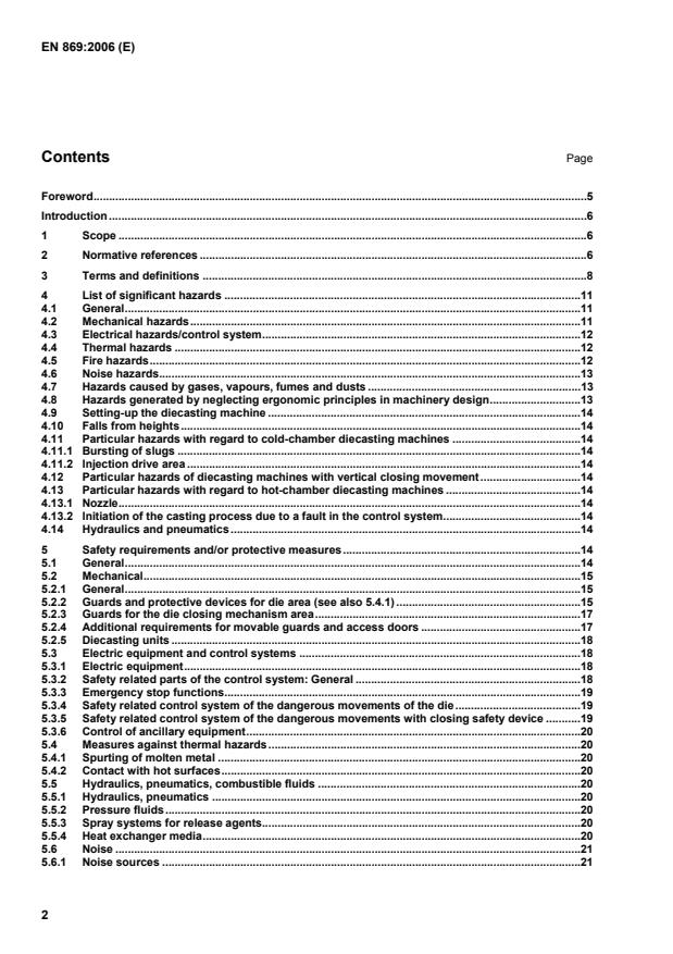 EN 869:2006 is a standard published by the European Committee for Standardization (CEN). Its full title is "Safety of machinery - Safety requirements for pressure metal diecasting units". This standard covers: This European Standard specifies the safety requirements for pressure metal diecasting units. It applies to pressure diecasting machines and to the interfaces with the following ancillary equipment: die, melting, holding and dosing furnaces (see EN 746-1), metal feeding equipment, inserting and removal devices, spraying appliances, heat exchanger for the die. This ancillary equipment itself is not covered. Additional risks arising from the material being cast are not covered. This standard does not apply to low pressure diecasting machines and/or gravity diecasting machines. This standard deals with all significant hazards, hazardous situations and events relevant to pressure diecasting machines when used as intended and under conditions of misuse which are reasonably foreseeable by the manufacturer (see Clause 4). It provides the requirements to be met by the manufacturer to ensure the safety of persons and property during transport, commissioning, use, de-commissioning and maintenance periods, as well as in the event of foreseeable failures or malfunctions that may occur in the equipment. This document is not applicable to pressure metal diecasting units/machinery which are manufactured before the date of its publication as EN.