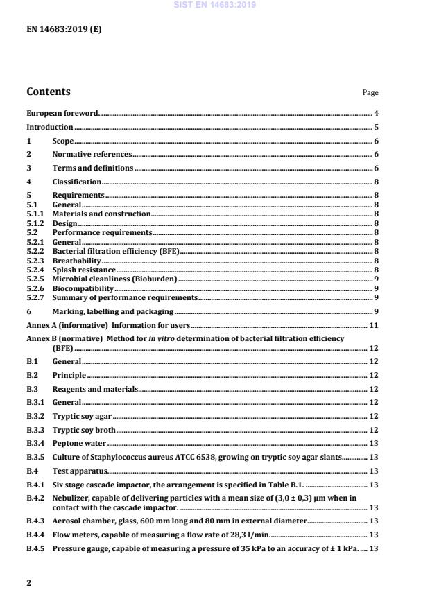 Method for in vitro determination of bacterial filtration efficiency (BFE) . 12 B.1 General . 12 B.2 Principle . 12 B.3 Reagents and materials . 12 B.3.1 General . 12 B.3.2 Tryptic soy agar . 12 B.3.3 Tryptic soy broth . 12 B.3.4 Peptone water . 13 B.3.5 Culture of Staphylococcus aureus ATCC 6538, growing on tryptic soy agar slants. . 13 B.4 Test apparatus. 13 B.4.1 Six stage cascade impactor, the arrangement is specified in Table B.1. . 13 B.4.2 Nebulizer, capable of delivering particles with a mean size of (3,0 ± contact with the cascade impactor. . 13 B.4.3 Aerosol chamber, glass, 600 mm long and 80 mm in external diameter. . 13 B.4.4 Flow meters, capable of measuring a flow rate of 28,3 l/min. . 13 B.4.5 Pressure gauge, capable of measuring a pressure of 35 kPa to an accuracy of ± 1 kPa. . 13 SIST EN 14683:2019
