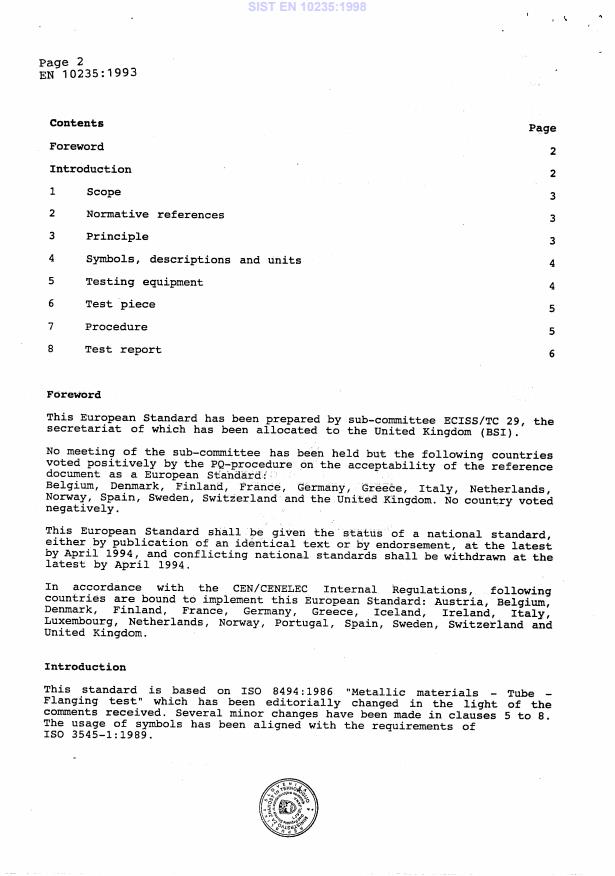 EN 10235:1993 is a standard published by the European Committee for Standardization (CEN). Its full title is "Metallic materials - Tube - Flanging test". This standard covers: This European Standard specifies a method for determining the ability of metallic tubes of circular cross section to undergo plastic deformation during flang formation. It is intended that the Standard should be applicable to tubes having an outside diameter not greater than 150mm and a wall thickness not greater than 10mm. The range of diameters or wall thickness for which this European Standard is applicable may be more exactly specified in the relevant product standard.