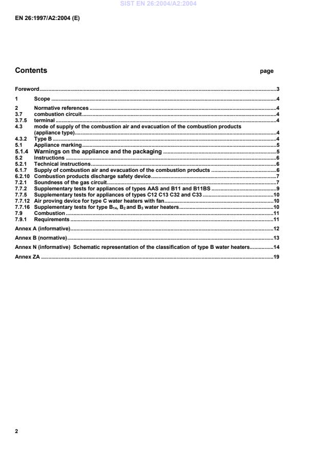 EN 26:1997/A2:2004 is a amendment published by the European Committee for Standardization (CEN). Its full title is "Gas-fired instantaneous water heaters for the production of domestic hot water, fitted with atmospheric burners". This standard covers: 2nd paragraph - 1st indent, add: "B11, B11BS, B12, B12BS, B13, B13BS, B14, B22, B23, B32, B33, B44, B52 and B53". 2nd paragraph - 1st indent, add the following footnote "National installation regulations may specify further requirements and may limit the modes of installation permitted in the territory of a CEN member state." 2nd paragraph - 3rd indent, delete: "hereafter referred to as "type C water heaters with fan". 4th paragraph, add the following indent: "- type B21, B31, B41, B42, B43 and B51 water heaters." After the 4th paragraph, add: "This standard only covers water heaters where the fan, if any, is an integral part of the appliance".