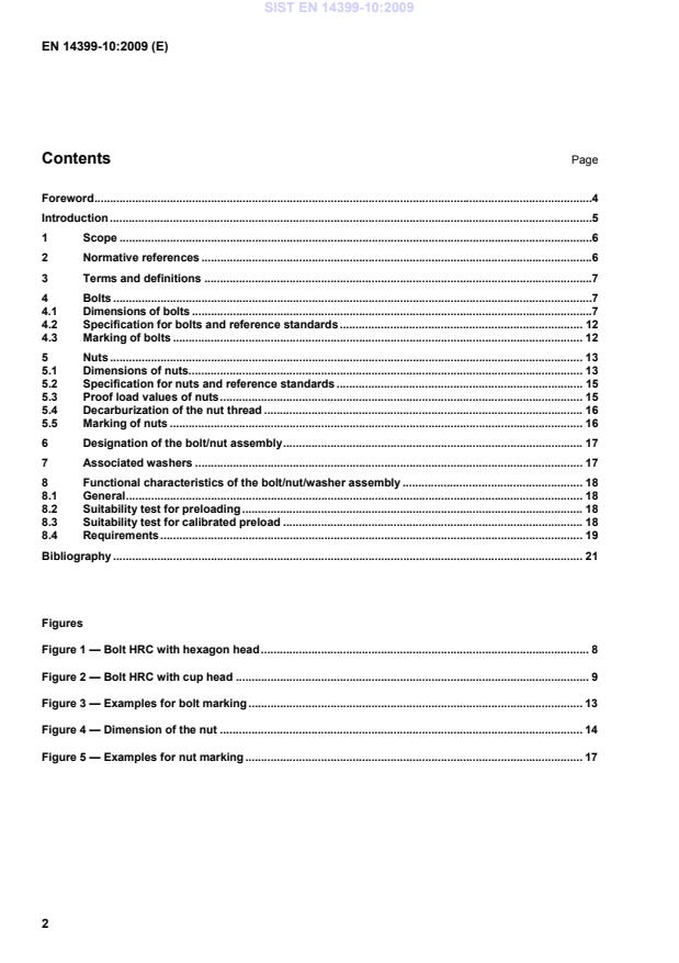 Figures Figure 1 — Bolt HRC with hexagon head . 8Figure 2 — Bolt HRC with cup head . 9Figure 3 — Examples for bolt marking . 13Figure 4 — Dimension of the nut . 14Figure 5 — Examples for nut marking . 17 SIST EN 14399-10:2009