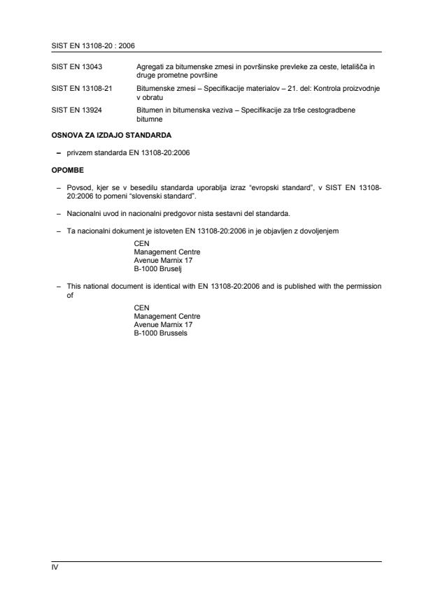 standardizacijo CEN/TC 227 Materiali za ceste. Slovenski standard SIST EN 13108-20:2006 je prevod