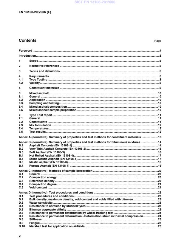 Test procedures and conditions.23 D.1 Test procedures and conditions.23 D.2 Bulk density, maximum density, void content and voids filled with bitumen.23 D.3 Water sensitivity.23 D.4 Resistance to abrasion by studded tyres.23 D.5 Bitumen aggregate affinity.23 D.6 Resistance to permanent deformation by wheel-tracking test.24 D.7 Resistance to permanent deformation - Deformation strain in triaxial compression.24 D.8 Stiffness.25 D.9 Fatigue.25 D.10 Marshall test for application on airfields.25 SIST EN 13108-20:2006