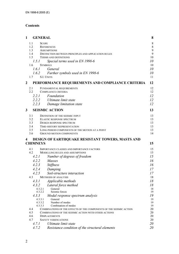 1 GENERAL 8 1.1 SCOPE 8 1.2 REFERENCES 8 1.3 ASSUMPTIONS 9 1.4 DISTINCTION BETWEEN PRINCIPLES AND APPLICATION RULES 9 1.5 TERMS AND DEFINITIONS 10 1.5.1 Special terms used in EN 1998-6 10 1.6 SYMBOLS 10 1.6.1 General 10 1.6.2 Further symbols used in EN 1998-6 10 1.7 S.I. UNITS 11 2 PERFORMANCE REQUIREMENTS AND COMPLIANCE CRITERIA 12 2.1 FUNDAMENTAL REQUIREMENTS 12 2.2 COMPLIANCE CRITERIA 12 2.2.1 Foundation 12 2.2.2 Ultimate limit state 12 2.2.3 Damage limitation state 12 3 SEISMIC ACTION 13 3.1 DEFINITION OF THE SEISMIC INPUT 13 3.2 ELASTIC RESPONSE SPECTRUM 13 3.3 DESIGN RESPONSE SPECTRUM 13 3.4 TIME-HISTORY REPRESENTATION 13 3.5 LONG PERIOD COMPONENTS OF THE MOTION AT A POINT 13 3.6 GROUND MOTION COMPONENTS 14 4 DESIGN OF EARTHQUAKE RESISTANT TOWERS, MASTS AND CHIMNEYS 15 4.1 IMPORTANCE CLASSES AND IMPORTANCE FACTORS 15 4.2 MODELLING RULES AND ASSUMPTIONS 15 4.2.1 Number of degrees of freedom 15 4.2.2 Masses 16 4.2.3 Stiffness 16 4.2.4 Damping 17 4.2.5 Soil-structure interaction 17 4.3 METHODS OF ANALYSIS 18 4.3.1 Applicable methods 18 4.3.2 Lateral force method 18 4.3.2.1 General 18 4.3.2.2 Seismic forces 19 4.3.3 Modal response spectrum analysis 19 4.3.3.1 General 19 4.3.3.2 Number of modes 19 4.3.3.3 Combination of modes 19 4.4 COMBINATIONS OF THE EFFECTS OF THE COMPONENTS OF THE SEISMIC ACTION 20 4.5 COMBINATIONS OF THE SEISMIC ACTION WITH OTHER ACTIONS 20 4.6 DISPLACEMENTS 20 4.7 SAFETY VERIFICATIONS 20 4.7.1 Ultimate limit state 20 4.7.2 Resistance condition of the structural elements 20