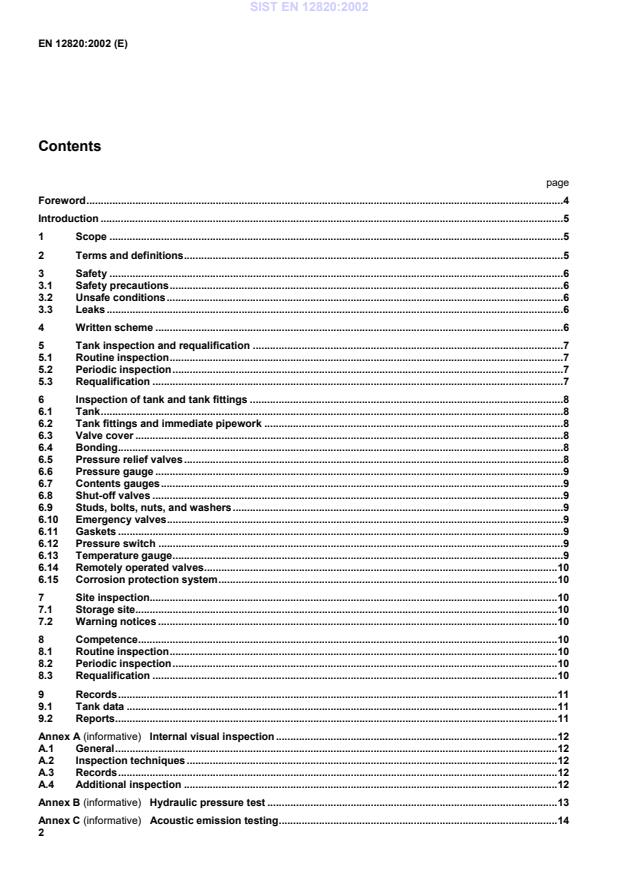 EN 12820:2002 is a standard published by the European Committee for Standardization (CEN). Its full title is "Inspection and requalification of LPG tanks greater than 13 m³ underground". This standard covers: This European Standard specifies requirements for: a) routine inspection, periodic inspection and requalification of underground and mounded LPG storage tanks of sizes greater than 13 m³, and associated fittings; b) marking tanks and/or keeping records, as appropriate, as a result of routine inspection, periodic inspection and requalification. This European Standard excludes refrigerated storage.