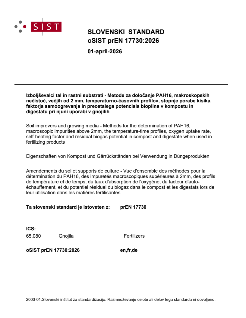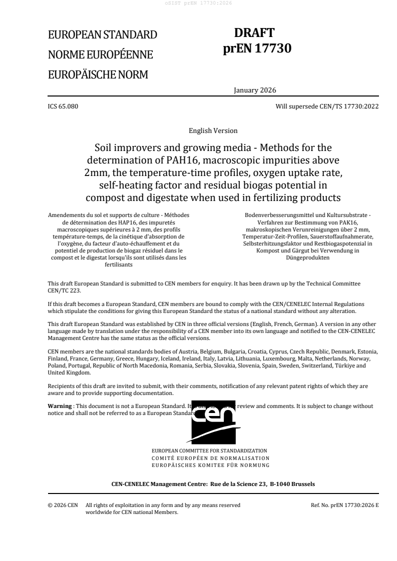 prEN 17730 is a draft published by the European Committee for Standardization (CEN). Its full title is "Soil improvers and growing media - Methods for the determination of PAH16, macroscopic impurities above 2mm, the temperature-time profiles, oxygen uptake rate, self-heating factor and residual biogas potential in compost and digestate when used in fertilizing products". This standard covers: This document refers to methods to be used for the determination of specific parameters in compost, fresh crop digestate and digestate other than fresh crop digestate when used as components of fertilizing products, but does not contain the methods themselves. The specific parameters in this document include: — the determination of the PAH16 content; — macroscopic impurities; — the determination of temperature-time profiles during composting and digestion; — oxygen uptake rate; — self-heating factor; — the determination of the residual biogas potential in digestate. This document is applicable to the fertilizing product blends where a blend is a mix of two or more fertilising products belonging to the categories of fertilizers, liming material, soil improvers, growing media, inhibitors and plant biostimulants, and where soil improvers and/or growing media are the components with the highest percentage in the blend by mass or volume, or in the case of products in liquid form by dry mass. If the soil improvers and/or growing media are not the components with the highest percentage in the blend, the European Standard relevant to the component with the highest percentage in the blend applies. In case a blend is composed of fertilising products mixed in equal quantities, the user of the standard decides which standard to apply. NOTE A soil improver or a growing medium consists of a single bulky (volume-building) component or a mix of bulky (volume-building) components (for example peat, wood fibres, coconut coir, compost, expanded perlite).
