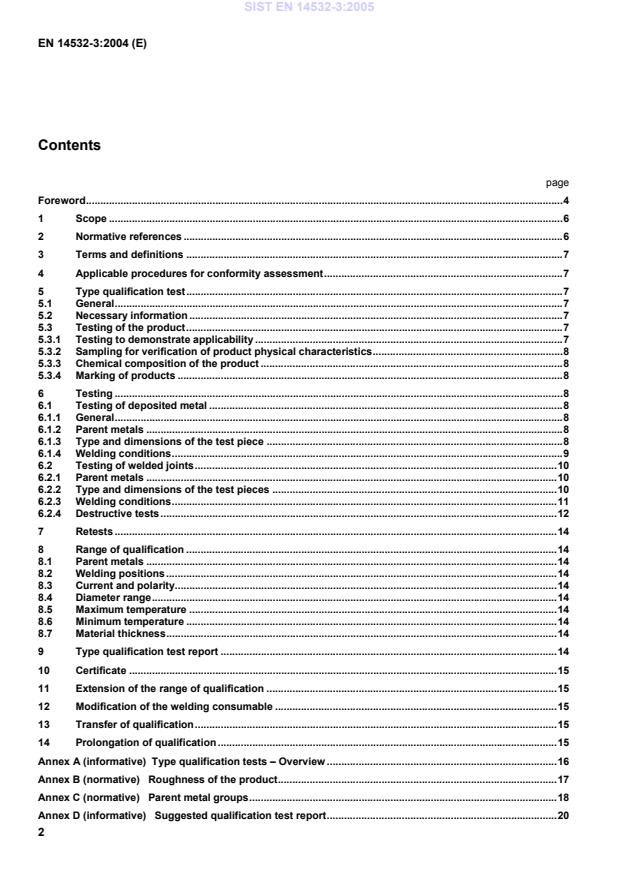 page Foreword.4 1 Scope.6 2 Normative references.6 3 Terms and definitions.7 4 Applicable procedures for conformity assessment.7 5 Type qualification test.7 5.1 General.7 5.2 Necessary information.7 5.3 Testing of the product.7 5.3.1 Testing to demonstrate applicability.7 5.3.2 Sampling for verification of product physical characteristics.8 5.3.3 Chemical composition of the product.8 5.3.4 Marking of products.8 6 Testing.8 6.1 Testing of deposited metal.8 6.1.1 General.8 6.1.2 Parent metals.8 6.1.3 Type and dimensions of the test piece.8 6.1.4 Welding conditions.9 6.2 Testing of welded joints.10 6.2.1 Parent metals.10 6.2.2 Type and dimensions of the test pieces.10 6.2.3 Welding conditions.11 6.2.4 Destructive tests.12 7 Retests.14 8 Range of qualification.14 8.1 Parent metals.14 8.2 Welding positions.14 8.3 Current and polarity.14 8.4 Diameter range.14 8.5 Maximum temperature.14 8.6 Minimum temperature.14 8.7 Material thickness.14 9 Type qualification test report.14 10 Certificate.15 11 Extension of the range of qualification.15 12 Modification of the welding consumable.15 13 Transfer of qualification.15 14 Prolongation of qualification.15 Annex A (informative)