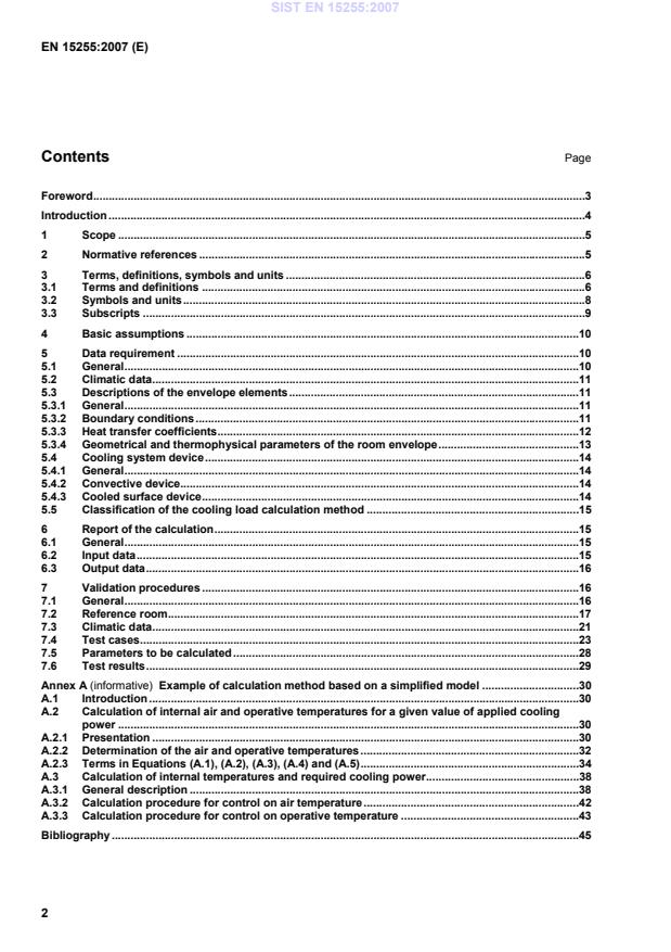 EXAMPLE A calculation method of class 3b is able to handle pure convective systems with infinite cooling capacity, continuous or intermittent operation, fixed cooling capacity, moveable shadings, and control of the room air or room operative temperature. It is not able to model cooled surfaces. 6 Report of the calculation 6.1 General According to this European Standard, the calculation report of cooling load shall include at least the input data specified in 6.2 and the output data as given in 6.3. 6.2 Input data a) the climatic data (hourly values of the external air temperature, solar radiation intensity, external radiant temperature); b) building characteristics: description of the building and the rooms investigated; c) for each room: 1) volume, in m3; SIST EN 15255:2007