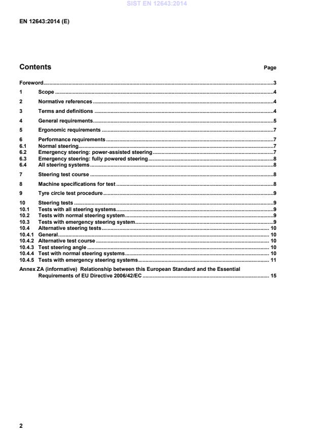 3.2.1 normal steering power source means for providing power to effect steering in either power-assisted or fully powered steering systems, for example, hydraulic pump, air compressor, electric generator 3.2.2 emergency steering power source means for providing power to the emergency steering system, for example, hydraulic pump, air compressor, accumulator, battery 3.2.3 failure of normal steering power source complete and instantaneous loss of a normal steering power source output. It is assumed that not more than one failure will occur at the same time 3.3 steering control element manual control means by which the operator provides muscular power inputs to the steering systems to effect the desired steering of the machine, including the typical steering-wheel or any equivalent manual control means 3.4 steering effort necessary force exerted by the operator on the steering control element in order to steer the machine 3.5 steering angle total displacement angle between the front wheels and the rear wheels as they move about one or more vertical steering axes from their normal straight-ahead condition to a turned condition Note 1 to entry: The steering angle for multiple axle machines is determined between the wheels at the farthest forward and the farthest rearward axle. Note 2 to entry: Ackermann steering inherently has a greater steering angle on the side of the machine towards the inside of the turn as compared to the wheels on the outside of the turn. Therefore, where Ackermann steering is involved, the location of the steering angle measurement also needs to be specified. A steering angle accomplished by a combination of geometries incorporating Ackermann steering is included, and also requires the location of steering angle measurement to be specified. 3.6 tyre circle outer tyre clearance diameter determined in accordance with Clause 9 3.7 working circuit pressure that nominal pressure applied to the specific circuit by the pump(s) 4 General requirements The following requirements apply to all steering systems within the scope of this European Standard. 4.1 The normal steering control element provided for the operator shall continue in all circumstances to be the steering control means of the operator. SIST EN 12643:2014