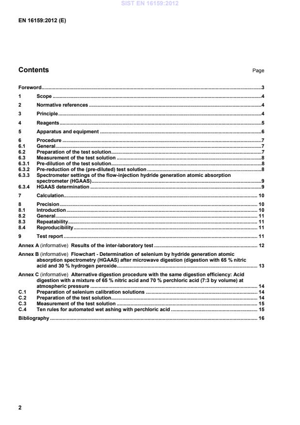 Alternative digestion procedure with the same digestion efficiency: Acid digestion with a mixture of 65 % nitric acid and 70 % perchloric acid (7:3 by volume) at atmospheric pressure . 14C.1Preparation of selenium calibration solutions . 14C.2Preparation of the test solution . 14C.3Measurement of the test solution . 15C.4Ten rules for automated wet ashing with perchloric acid . 15Bibliography . 16 SIST EN 16159:2012