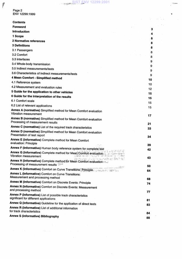 ENV 12299:1999 is a standardization document published by the European Committee for Standardization (CEN). Its full title is "Railway applications - Ride comfort for passengers - Measurement and evaluation". This standard covers: This European Prestandard specifies a method for quantifiying th effects of carbody movements on Ride comfort for passengers ("Comfort"). This scope of the standard is limited to public railway services; the standard includes railway vehicles designated for carrying passengers travelling on railway lines,including secondarty and suburban lines; this documen can be used as a guide for other railways vehicles, for example locomotives, metros, trams, etc. This standard applies to passengers in generally good health.