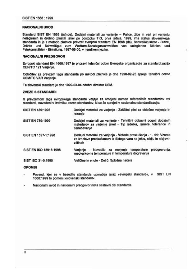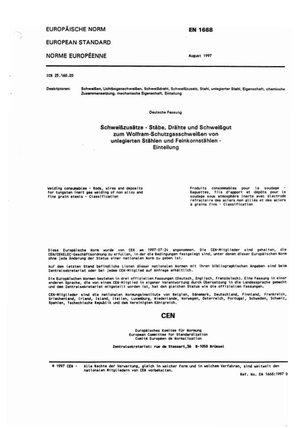 EN 1668:1997 is a standard published by the European Committee for Standardization (CEN). Its full title is "Welding consumables - Rods, wires and deposits for tungsten inert gas welding of non alloy and fine grain steels - Classification". This standard covers: This standard specifies requirements for classification of rods, wires and all-weld metal in the as-welded condition for tungsten inert gas welding of non alloy and fine grain steels with a minimum yield strength of up to 500 N/mm2 in the as-welded condition.