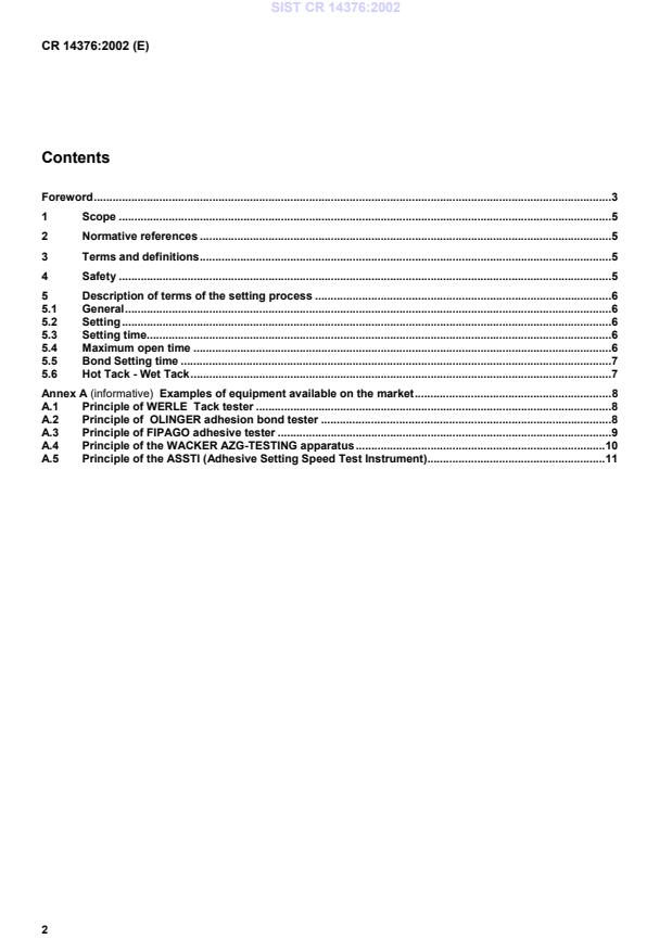 CR 14376:2002 is a standardization document published by the European Committee for Standardization (CEN). Its full title is "Adhesives - Adhesives for paper and board, packaging and disposable sanitary products - Description and assessment of the setting process". This standard covers: The setting of an adhesive is a complex process, during which the adhesive develops its cohesive strength. It takes place in several phases, which are affected by numerous factors e.g. environmental conditions, substrates, coating weight, etc. Terms commonly used, related to the setting process are e.g. open time (correctly termed maximum open time), wet tack, hot tack, green tack, closed time, setting time. This European standard defines these terms in detail and describes the various aspects of the setting procedures used to assess the setting process.