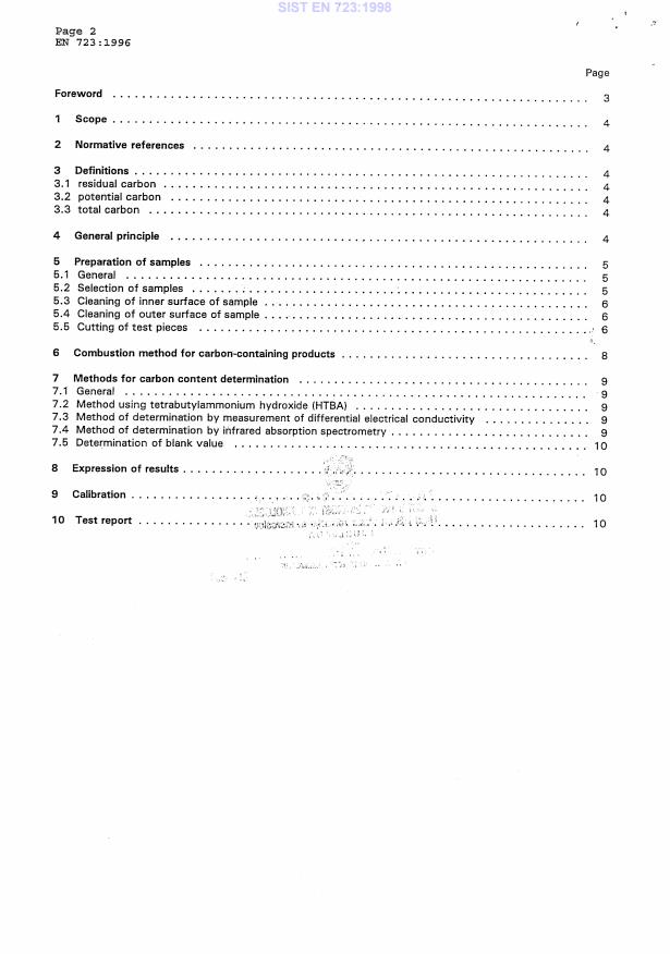 EN 723:1996 is a standard published by the European Committee for Standardization (CEN). Its full title is "Copper and copper alloys - Combustion method for determination of carbon on the inner surface of copper tubes or fittings". This standard covers: This European Standard specifies a combustion method for determining the carbon content, if any, on the inner surface of copper tubes or copper fittings. This standard applies only to round copper tubes as specified in prEN 1057 or copper fittings as specified in prEN 1254-1 and prEN 1254-5.