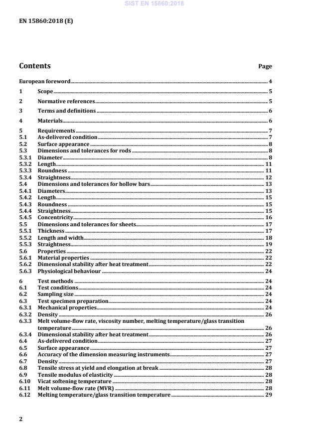 f1 (see Figure 4 a)) f2 (see Figure 4 b)) f3 (see Figure 4 c)) up to 6 6,0 7,0 4,0 over 6 up to 16 4,0 5,0 over 16 up to 25 2,5 3,5 over 25 up to 50 2,0 over 50 1,5 Deviating straightness requirements shall be agreed upon between manufacturer and customer. NOTE The limit values in Table 8 apply to unmachined sheets made from modified and non-modified materials. 5.6 Properties 5.6.1 Material properties The property values shall be in accordance with the manufacturer's declaration and shall be documented. Some guideline values for material properties are given in Annex D. 5.6.2 Dimensional stability after heat treatment The dimensional stability after heat treatment is determined by means of the test described in 6.14 as well as described in Annex C. The relative changes in length, thickness and diameter of semi-finished products made from non-modified materials such as polyamide (PA), polybutylene terephthalate (PBT), polycarbonate (PC), polyetheretherketone (PEEK), polyethylene terephthalate (PET), polyoxymethylene (POM), polystyrene modified polyphenylene ether (PPE+PS) and polyvinylidenfluoride (PVDF) shall not exceed the guideline values given in Table 9 derived from measurements from sheets 20 mm high and rods with a diameter of 50 mm to 60 mm. NOTE There are no values available yet for the other materials listed in Table 1. SIST EN 15860:2018