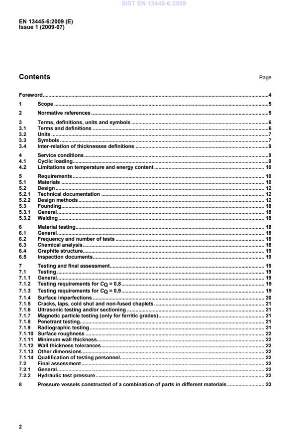Issue 1 (2009-07) 2 Contents Page Foreword.4 1 Scope.5 2 Normative references.5 3 Terms, definitions, units and symbols.6 3.1 Terms and definitions.6 3.2 Units.7 3.3 Symbols.7 3.4 Inter-relation of thicknesses definitions.9 4 Service conditions.9 4.1 Cyclic loading.9 4.2 Limitations on temperature and energy content.10 5 Requirements.10 5.1 Materials.10 5.2 Design.12 5.2.1 Technical documentation.12 5.2.2 Design methods.12 5.3 Founding.18 5.3.1 General.18 5.3.2 Welding.18 6 Material testing.18 6.1 General.18 6.2 Frequency and number of tests.18 6.3 Chemical analysis.18 6.4 Graphite structure.19 6.5 Inspection documents.19 7 Testing and final assessment.19 7.1 Testing.19 7.1.1 General.19 7.1.2 Testing requirements for CQ = 0,8.19 7.1.3 Testing requirements for CQ = 0,9.19 7.1.4 Surface imperfections.20 7.1.5 Cracks, laps, cold shut and non-fused chaplets.21 7.1.6 Ultrasonic testing and/or sectioning.21 7.1.7 Magnetic particle testing (only for ferritic grades).21 7.1.8 Penetrant testing.21 7.1.9 Radiographic testing.21 7.1.10 Surface roughness.22 7.1.11 Minimum wall thickness.22 7.1.12 Wall thickness tolerances.22 7.1.13 Other dimensions.22 7.1.14 Qualification of testing personnel.22 7.2 Final assessment.22 7.2.1 General.22 7.2.2 Hydraulic test pressure.22 8 Pressure vessels constructed of a combination of parts in different materials.23 SIST EN 13445-6:2009