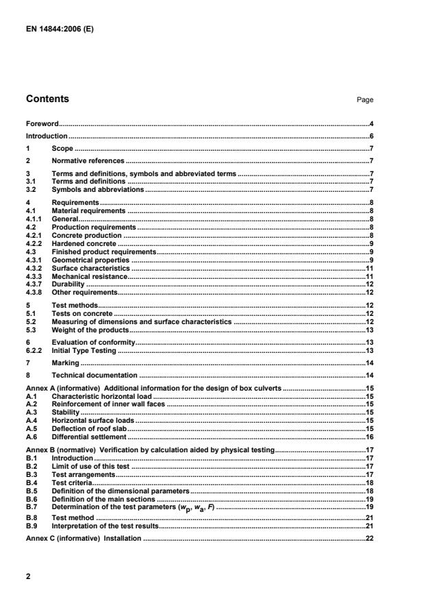 EN 14844:2006 is a standard published by the European Committee for Standardization (CEN). Its full title is "Precast concrete products - Box culverts". This standard covers: This standard deals with both large (structural) and small (non-structural or light structural) box culverts of rectangular cross-section formed monolithically and designed as continuous elements with a joint detail shaped to allow the possible incorporation of sealing materials. Box culverts can be used for creation of voids below ground for conveyance and storage of materials. e.g. conveyance and storage of wastewater, cable tunnels and subways For the purposes of this standard, box culverts having internal cross-sectional dimensions (W and H in Figure 1) less than or equal to 1 250 mm should be considered as small (non-structural or light structural). All other units should be defined as large. The elements are generally manufactured in factories using either normal weight or lightweight concrete and usually require reinforcing steel. This standard does not include units manufactured from autoclaved aerated concrete, nor prefabricated reinforced box culverts of lightweight concrete with open structure. Each unit is structurally complete. They are used in combination to form a total structure of appropriate length (including joints) and capacity.
